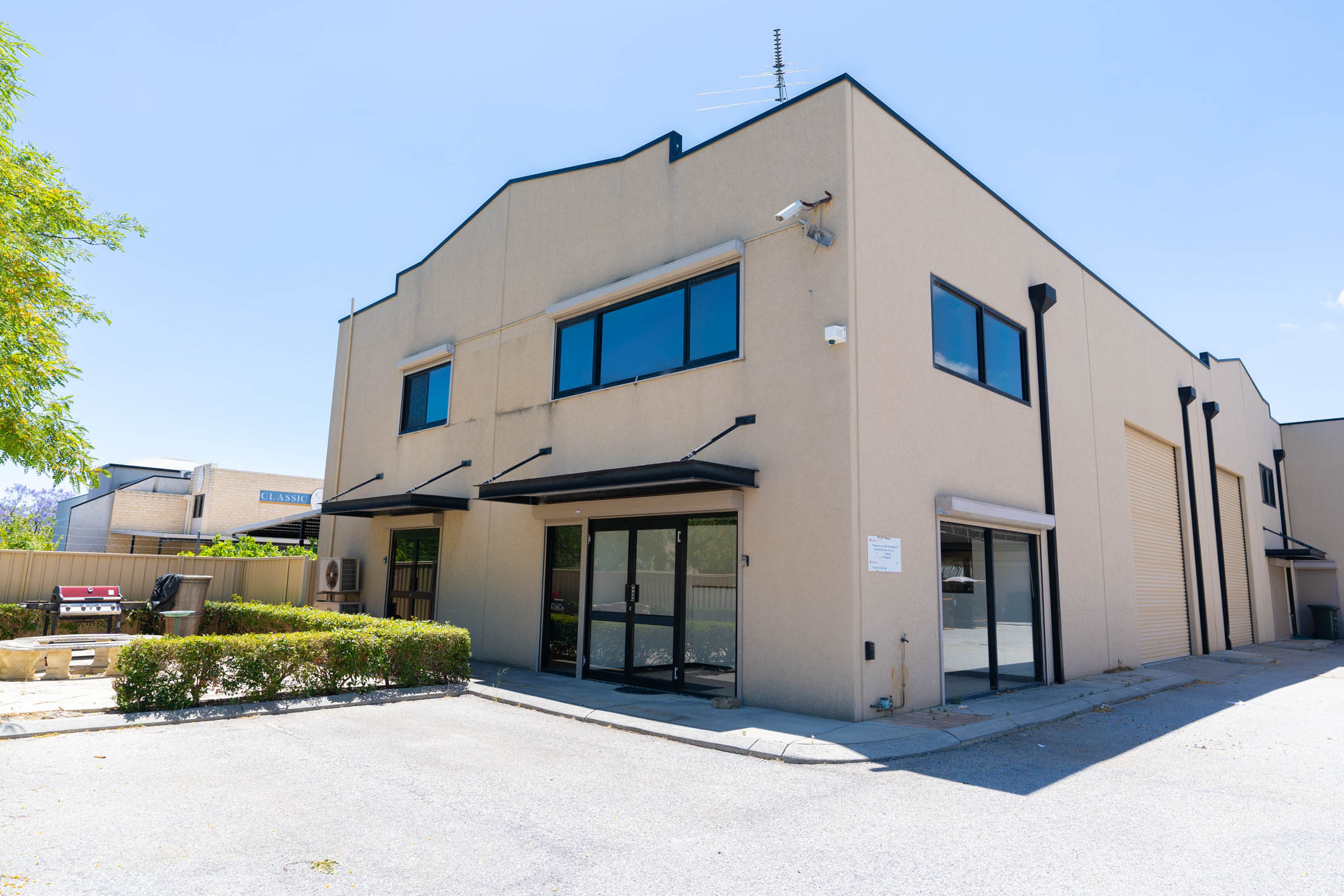 • Warehouse (80 sqm*): Roof height 6.8m, roller door (4.3mW x 4.5mH), hi bay lights, 20amp three phase point.