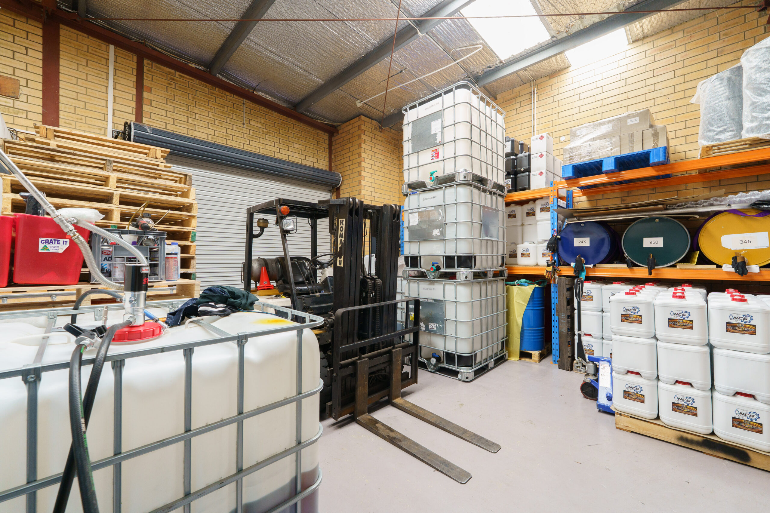 Warehouse: roof height up to 4.7m, roller door 3.4mW x 3mH, hi bay lights.